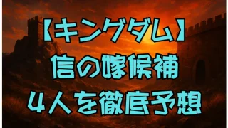 キングダム【キングダム】信の嫁候補4人を徹底考察|羌瘣・河了貂・陽・翡翠の可能性と最終予想 『キングダム』信の嫁候補4人を徹底考察。羌瘣・河了貂・陽・翡翠の魅力と関係性、結婚相手最有力予想まで解説 2024.01.15キングダム